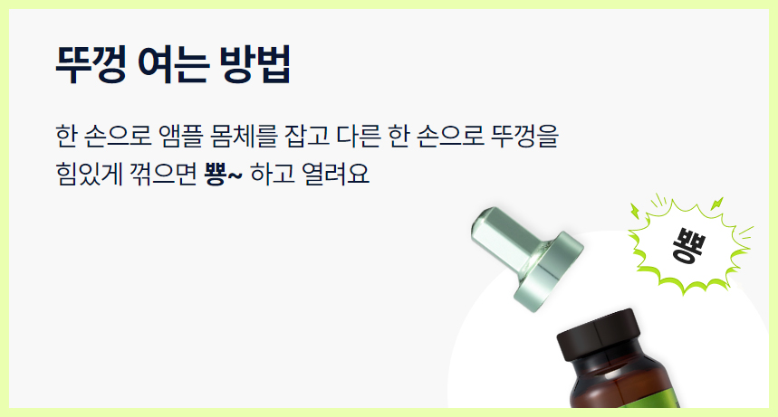 라라올라 뚜껑 여는법은 한 손으로는 앰플몸체를 잡고 다른 한손으로 뚜껑을 힘 있게 꺾으면 뿅 하고 열립니다.