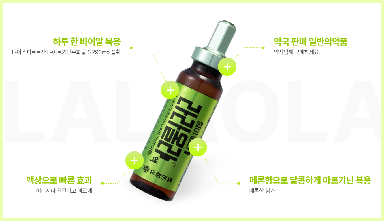 피로회복과 에너지생성에 좋은 유효성분 L-아르기닌과 L-아스파르트산 함유되어 있고 액상형식이라 몸에 빠르게 흡수되어 효능을 바로 느낄 수 있는 것이 특징입니다.