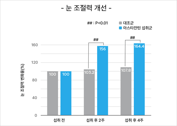 임상시험 기간은 4주였으며 성인 40명이 매일 헤마토코쿠스 추출물인 아스타잔틴 6mg을 섭취하였습니다. 터치나 클릭해서 그래프를 더 크게 보며 수치를 확인해 보세요.