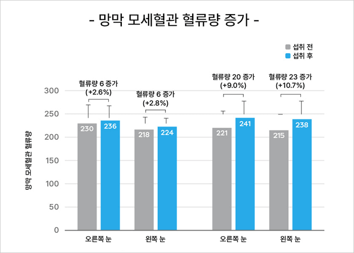 아래는 기능성원료인 헤마토코쿠스 추출물 임상 시험 결과를 나타낸 표입니다. 망막 모세혈관 혈류량, 눈 조절력, 눈 조절 긴장 속도 및 조절 이완속도 개선에 대한 변화율을 확인할 수 있습니다.