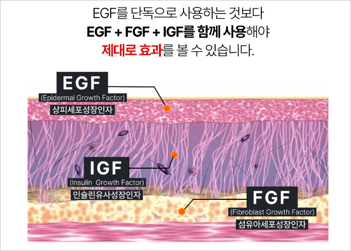 ● EGF(상피세포성장인자) : 피부 세포의 성장을 촉진하여 새로운 세포 생성을 돕고, 상처 치유에도 효과적입니다.