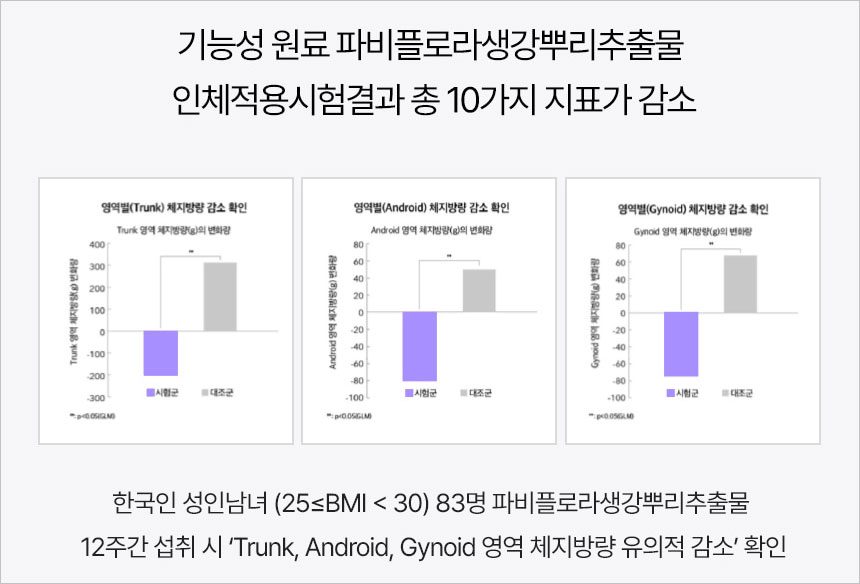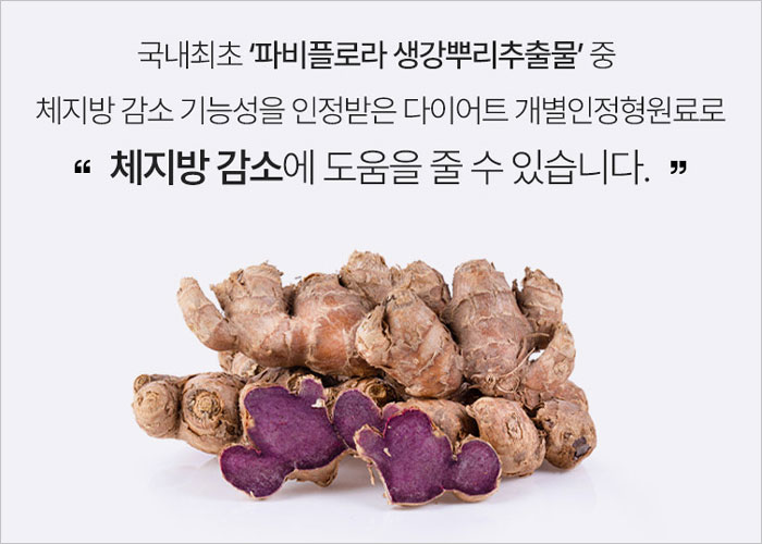 파비플로라에 함유된 생강 뿌리 추출물이 체내 지방 세포의 크기를 줄이고, 새로운 지방 세포 생성을 억제하는 데 도움을 줄 수 있습니다. 또한, 지방 분해 효소를 활성화하여 체지방을 에너지로 전환하는 과정을 촉진시켜 줍니다.