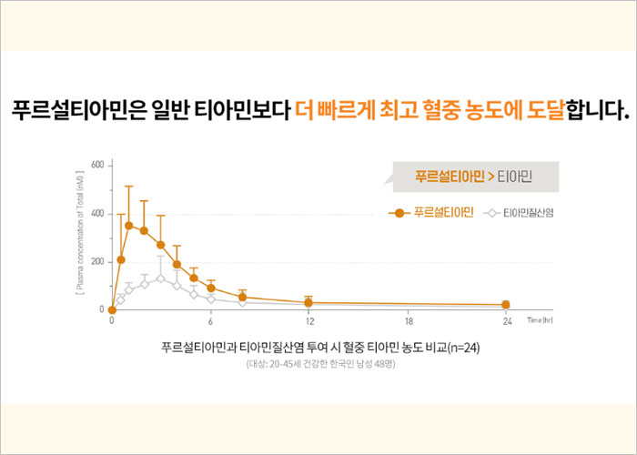 또한 푸르설티아민은 혈액 내 장벽을 통과하는 능력으로 뇌에 빠르게 전달되어 피로 해소에 탁월한 효과를 보여, 바쁜 일상 속 지친 몸과 마음에 활력을 불어넣고 일상생활의 활력을 높이는데 도움이 될 수 있습니다.