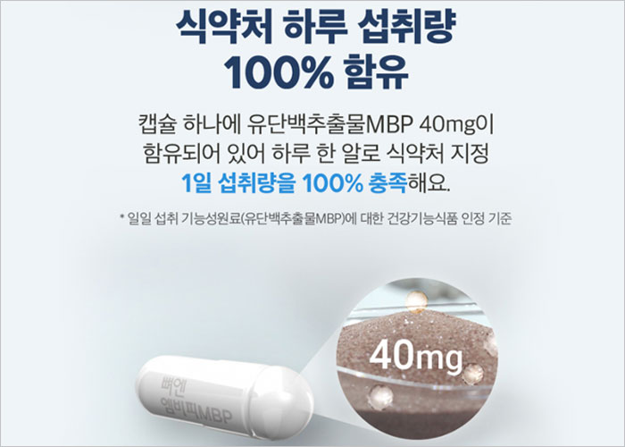 뼈엔 엠비피 MBP 한알에는 식약처 하루 섭취량 40mg기준 100%가 들어있어, 특히, 칼슘 흡수를 돕고 뼈의 재생을 촉진하는 효과로 뼈 건강에 대한 고민이 있는 분들에게 인기가 많답니다.