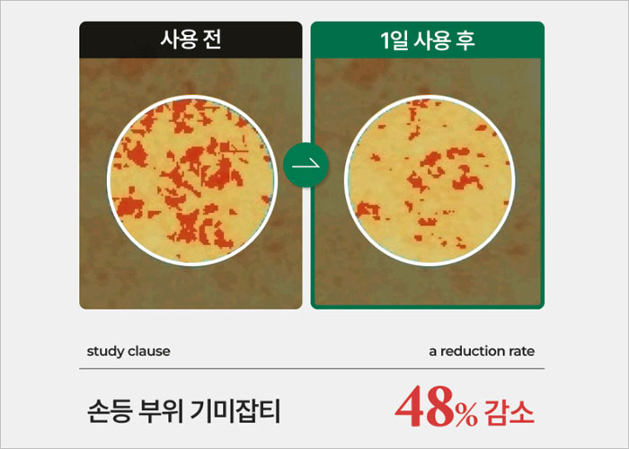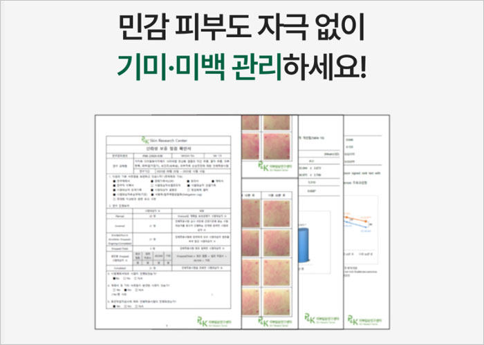 임상 시험 결과, 1주일 만에 손등 부위의 기미잡티가 48% 개선되었고, 2주 후에는 멜라닌 색소가 60% 감소하였으며, 10년 이상 된 깊고 진한 얼굴의 기미와 잡티가 1일 만에 9.9% 개선되는 효과를 보였다고 해요.