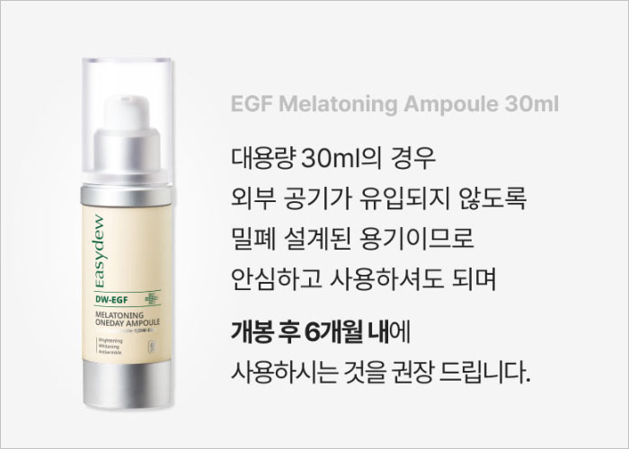 이지듀 기미앰플 사용방법은 깨끗하게 세안한 후 토너를 사용하여 피부결을 정돈하고, EGF앰플을 고민되는 부위에 고르게 펴 바른 뒤 두드려 흡수시켜 준후 마무리로 크림을 바르면 됩니다. 이때 기미가 있는 부위에 집중적으로 발라주면 효과를 더욱 높일 수 있다고 해요.