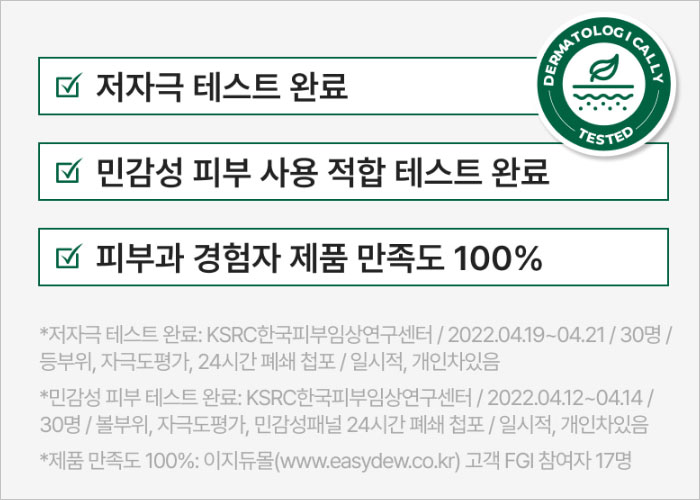 이지듀 기미앰플은 온 가족이 사용 가능할 정도로 민감 피부도 자극 없이 사용가능한 장점이 있어요. 저자극과 민감성 피부 사용 적합 테스트를 완료함과 동시에 피부과 경험자 제품 만족도 조사에서 만족지수 100%를 달성했다고 해요.