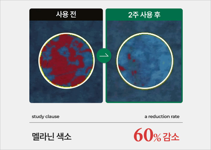 임상 시험 결과, 1주일 만에 손등 부위의 기미잡티가 48% 개선되었고, 2주 후에는 멜라닌 색소가 60% 감소하였으며, 10년 이상 된 깊고 진한 얼굴의 기미와 잡티가 1일 만에 9.9% 개선되는 효과를 보였다고 해요.