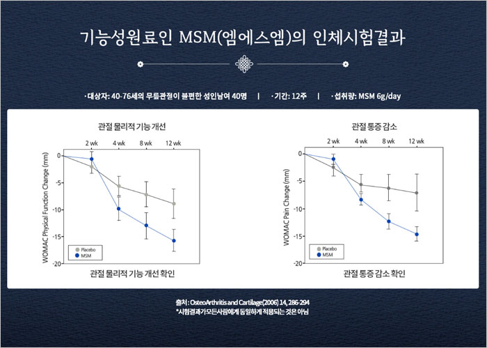 MSM은 관절 연골의 주요 구성 성분인 황을 공급하게 해 주어 손상된 연골을 재생시키고 연골을 건강하게 유지하게 하는 데 도움을 줄 수 있습니다. 또한, 보스웰리아, 해조칼슘, 젖산칼슘 등의 다양한 부원료의 시너지 효과는 관절 건강뿐만 아니라 전반적인 몸의 건강 개선에도 효과가 있습니다.