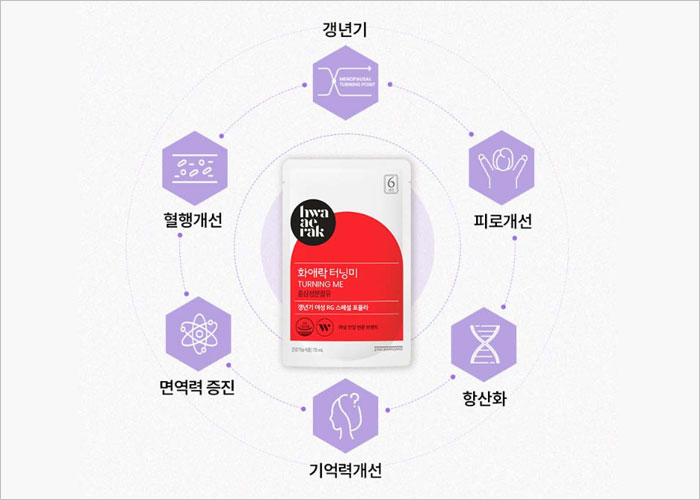 갱년기 하면 가장 먼저 떠오르는 소개가 바로 홍삼인데요. 정관장 화애락 터닝미에 들어있는 6년 근 홍삼과 당귀, 작약성분이 여성의 생리 기능을 조절하고 혈액 순환을 개선하여 갱년기 여성의 안면홍조, 발한 등을 완화하는 데 도움을 줍니다.