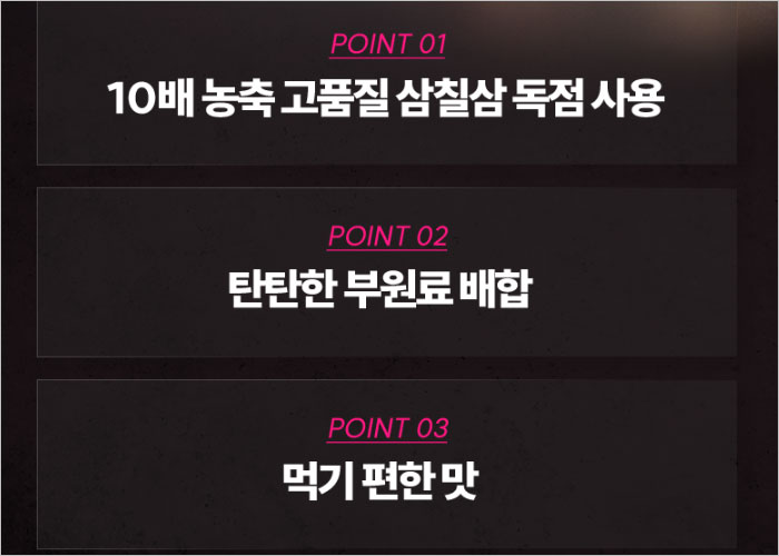 10배 농축된 삼칠삼은 쓴맛이 아주 강한데요. 풀업373 여러 배합을 통해 당도가 높지 않고 쓴맛을 잡아주는 적포도 농축액을 사용해 누구나 부담없이 맛있게 섭취가 가능한것이 장점입니다.