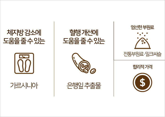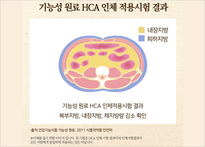 기능성 원료인 가르시니아 추출물의 인체 시험결과에 의하면 체중감소, 내장지방 감소, 체지방량 감소 복부지방감소, 허리둘레 감소, 엉덩이둘레 감소등을 확인할 수 있습니다.