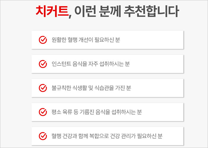 치커트에 함유된 HK 나토배양물은 혈전을 용해하고 혈액 순환을 개선하여 여러 가지 혈행 관련 증상 완화에 도움을 줄 수 있습니다.