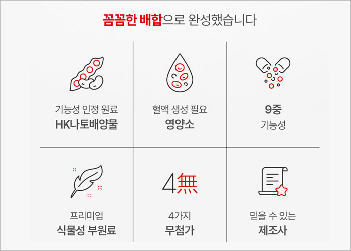 • HK 나토배양물: 혈전 생성을 억제하고 혈액 순환을 개선하여 혈관 건강을 유지하는 데 도움을 줍니다.