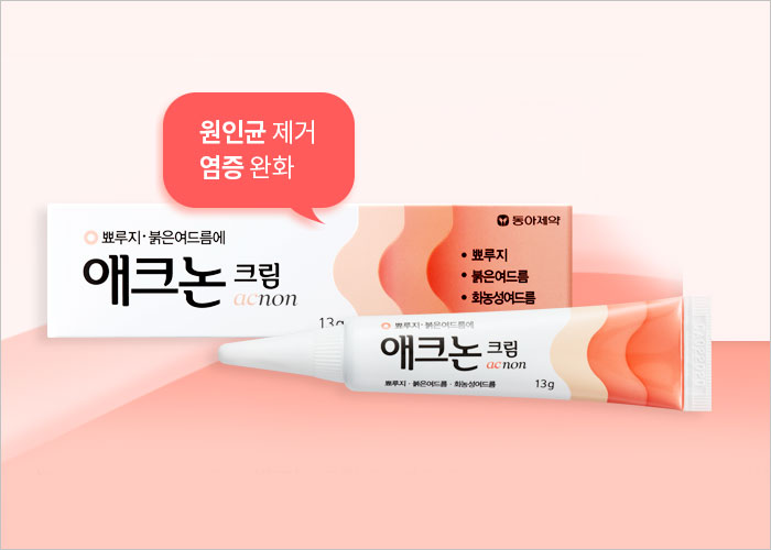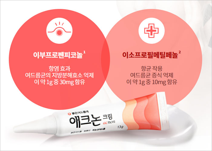 애크논 크림은 동아제약에서 출시한 여드름 치료제로, 이부프로펜피코놀, 이소프로필메틸페놀 등의 강력한 성분을 함유하여 트러블을 일으키는 세균에 대한 항염효과로 여드름 균의 증식을 억제하고 여드름균의 지방 분해효소를 억제하여 피지분비를 완화시키는데 탁월한 효과를 보입니다.