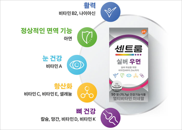 센트룸 실버 우먼은 50세 이상의 여성들에게 필요한 영양소를 효과적으로 보충해주는 제품으로 꾸준히 섭취하면 활력 넘치는 일상을 되찾는데 도움을 받을수 있습니다. 건강한 삶을 위한 첫걸음을 센트룸 실버 우먼과 함께 시작해 보는것도 좋겠습니다.