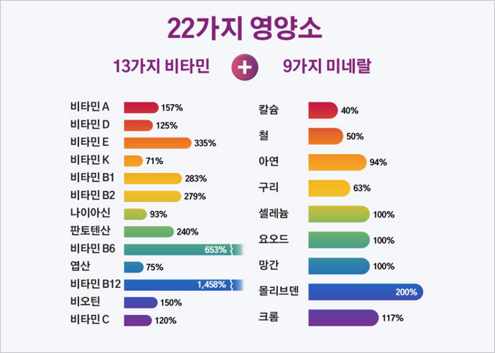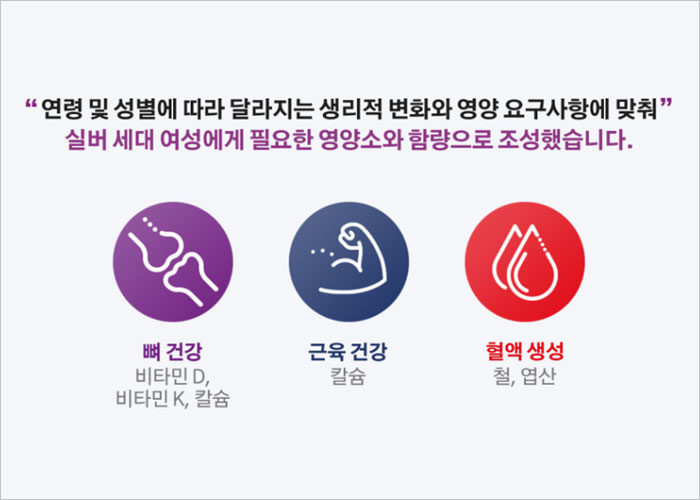 성별과 나이에 따라 우리몸이 필요로하는 영양성분은 각기 다를수 있는데요. 완경을 앞둔 50대 여성에게 꼭 필요한 칼슘, 비타민 D, 비타민 B군 등을 포함하여 면역역 증진에 도움을 주는 비타민 C와 아연, 눈건강에 좋은 비타민A까지 포함되어 전반적인 신체 건강을 지키는데 도움을 받을수 있습니다.