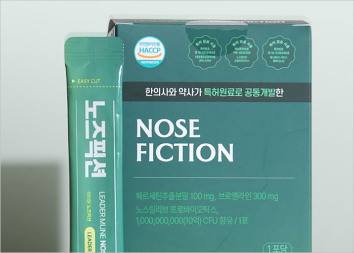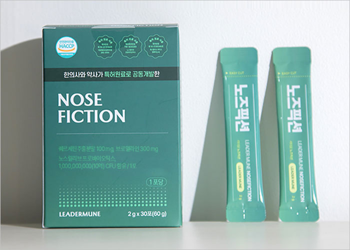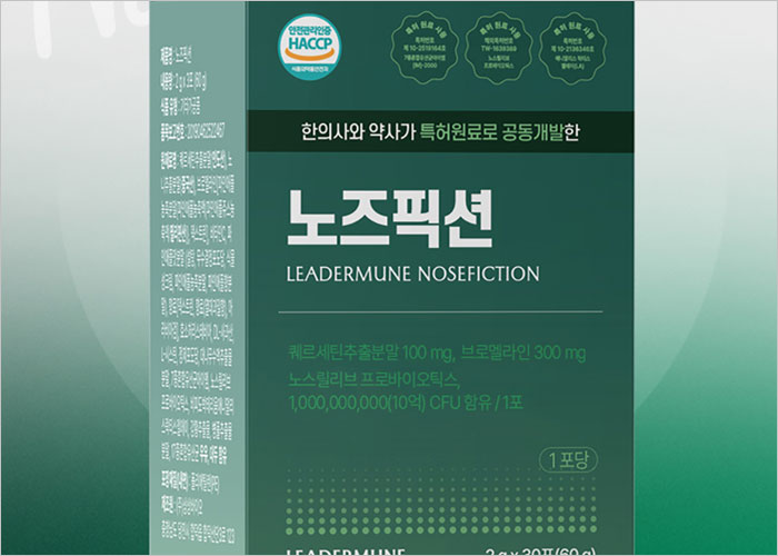 리더뮨 노즈픽션은 비염 증상을 개선하기 위해 특별히 개발된 영양제로 노즈릴리브 성분을 포함하고 있습니다.
