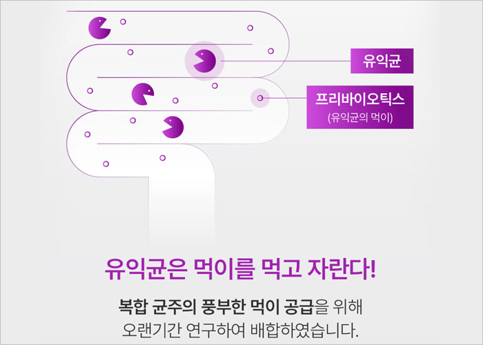 유익균의 먹이가 되는 프리바이오틱스를 함유하여 유익균 증식을 촉진하고, 장내 유익균과 유해균의 균형을 맞추어 주어 만성 염증을 완화하고 장 건강을 회복시켜줍니다.