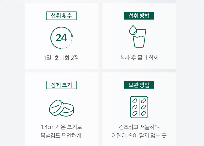 식사 후 물과 함께 복용하거나, 공복에 부담을 느끼는 분들은 식후에 섭취해도 좋습니다. 작은 크기로 목넘김이 편안하여 누구나 쉽게 섭취할 수 있습니다.