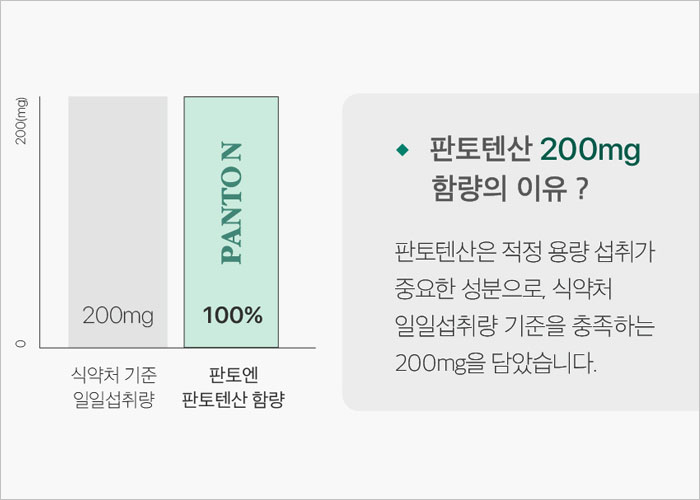 판토텐산은 수용성 비타민으로 체내에 저장되지 않기 때문에, 매일 섭취를 통해 보충해 주어야 하기에 효과적인 관리를 위해서는 꾸준히 섭취해주는것이 좋은데요. 판토엔의 경우 식약처 기준 일일섭취량 200mg가 100% 충족 되어있어 매일매일 최적의 용량 섭취가 가능 합니다.