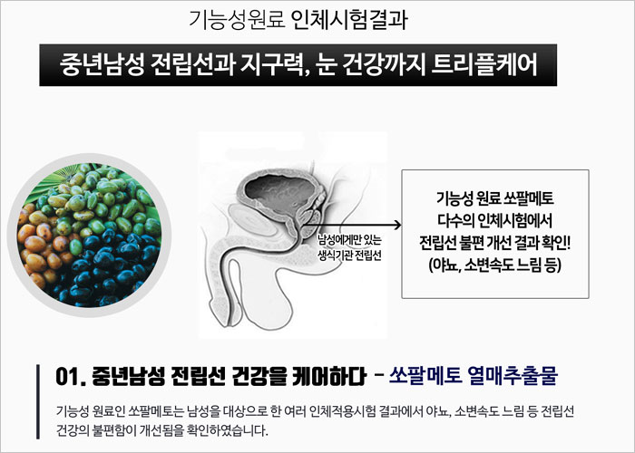 12가지 기능성 원료의 완벽한 조화는 전립선, 눈, 지구력, 면역력, 뼈 건강까지 한 번에 해결 가능합니다.