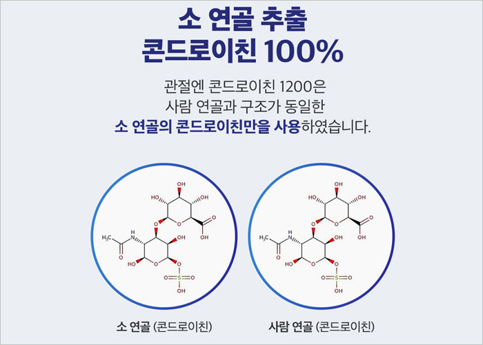 관절엔 콘드로이친 1200은 사람연골과 구조가 동일한 소연골의 콘드로이친만을 사용하였습니다.