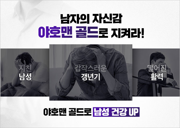 야호맨 골드는 이미 입소문만으로도 남성 건강을 위한 필수 아이템으로 자리 잡고 있습니다. 남성 갱년기로 고민하고 있다면 호로파 종자 추출물, 비수리, 과라나등의 효능을 느낄수 있는 야호맨 골드를 통해 자신감을 되찾아 보세요. 이름처럼 '야호~~'를 외치던 젊은 날의 나를 다시 만나게 될지도 모릅니다.