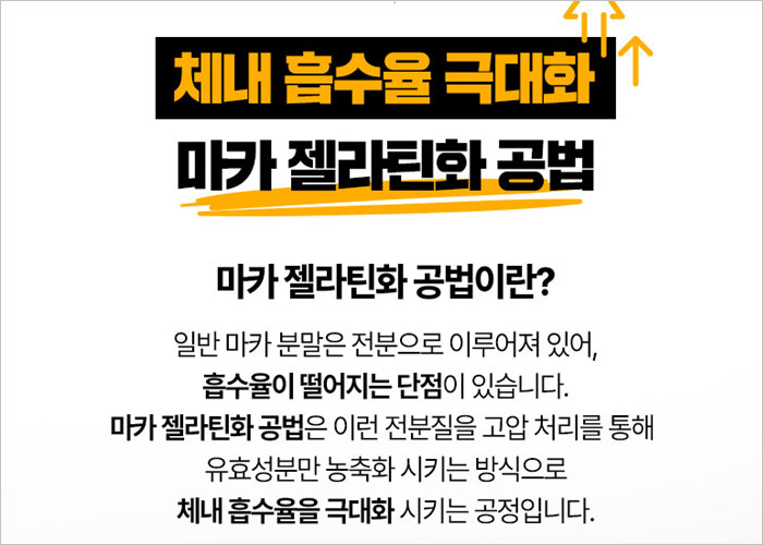 또한 블랙마카의 체내 흡수율 최대화를 위해 마카 젤라틴화 공법(전분질을 고압 처리하여 유효 성분을 농축)을 통해 전분이 많아 흡수율이 떨어지는 마카의 단점을 극복하여 체내 흡수율을 극대화시켜 최상의 효과를 경험할 수 있게 하였습니다. 특히 페루산 블랙마카의 진위 보장을 위해수입 신고증이 발급되어 있는점은 소비자에게 신뢰감을 제공해 줍니다.