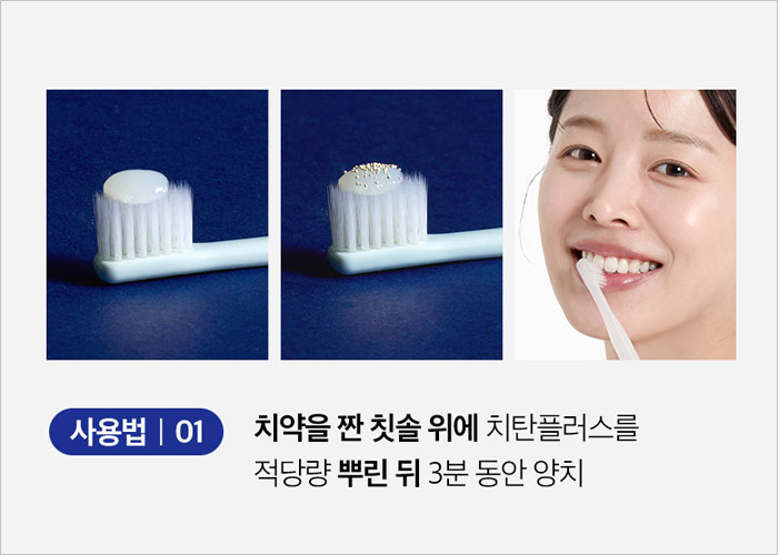 치탄 플러스는 매우 간편하게 사용할 수 있습니다. 하루 3회, 평소 사용하는 치약 위에 적당량을 뿌리기만 하고 양치하면 됩니다. 치약에 뿌리는 것이 번거롭다고 생각되면 입안에 치탄 플러스를 적당량 털어 넣고 혀로 고루 묻힌 후, 3분 동안 양치하는 것도 괜찮은 방법입니다.
