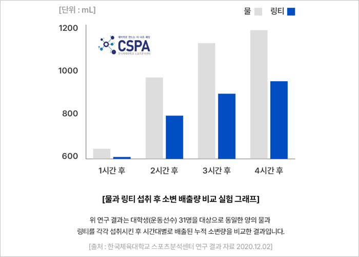 링티는 포도당과 나트륨의 이상적인 배합을 통해 물보다 훨씬 높은 수분 흡수율을 자랑합니다. 한국체육대학교 스포츠센터에서 진행된 임상시험 결과, 링 티 섭취 시 물만 섭취했을 때보다 소변 배출량이 현저히 적어 체내 수분 보유량이 높음을 입증했습니다.